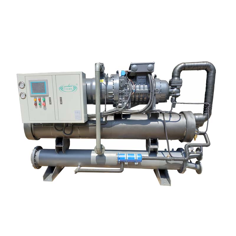 機(jī)組的冷凝器、干式蒸發(fā)器均采用高效傳熱管,主機(jī)選用高效的半封閉雙螺桿式壓縮機(jī),具有結(jié)構(gòu)緊湊、體積小、重量輕、 安裝位置小等諸多優(yōu)點(diǎn)。半封閉雙螺桿壓縮機(jī)運(yùn)動(dòng)部件少,壓縮機(jī)采用5:6超高效螺桿轉(zhuǎn)子,轉(zhuǎn)子之間沒(méi)有直接。